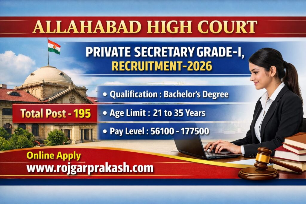 | Short Information : | Allahabad High Court, Private Secretary, Recruitment-2026 : The High Court of Judicature at Allahabad has Released an Official Notification for the Recruitment of Private Secretary Grade-I Posts. Eligible candidates who are looking for a government job opportunity in the judiciary can apply online for this recruitment. The recruitment will be conducted under the Allahabad High Court Private Secretaries (Condition of Service) Rules, 2001, and the selection process will be carried out through an examination and skill test as per the detailed advertisement. A total of 195 vacancies have been announced for the Post of Private Secretary Grade-I. Candidates who have a bachelor’s degree and strong typing and shorthand skills can apply for this recruitment. The online applications are invited from 12 March to 1 April 2026. | ||||||||||||||||||||