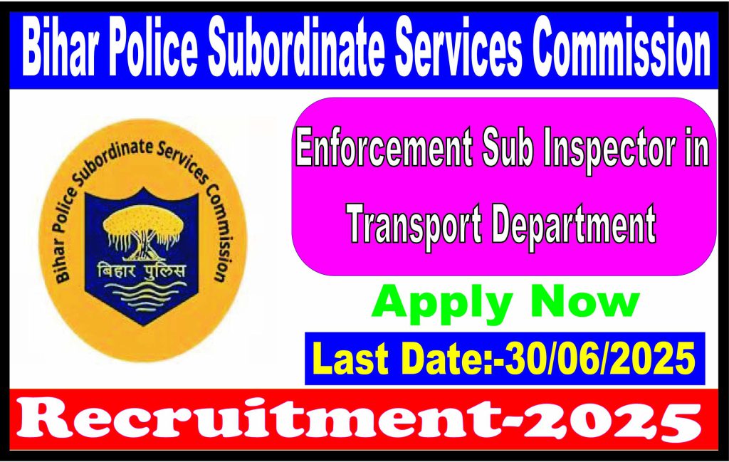 Short Information :Bihar Police Subordinate Services Commission  BPSSC has released the advertisement Bihar Police Enforcement Sub Inspector in Transport Department, Government of Bihar. Those Candidates Are Interested with BPSSC Enforcement Sub Inspector ESI Can Apply Online from 30/05/2025 to 30/06/2025. For other information related to Bihar Police Enforcement Sub Inspector in Transport Department Exam-2025 recruitment like age limit, qualification, pay scale and all other information read the advertisement and then apply.