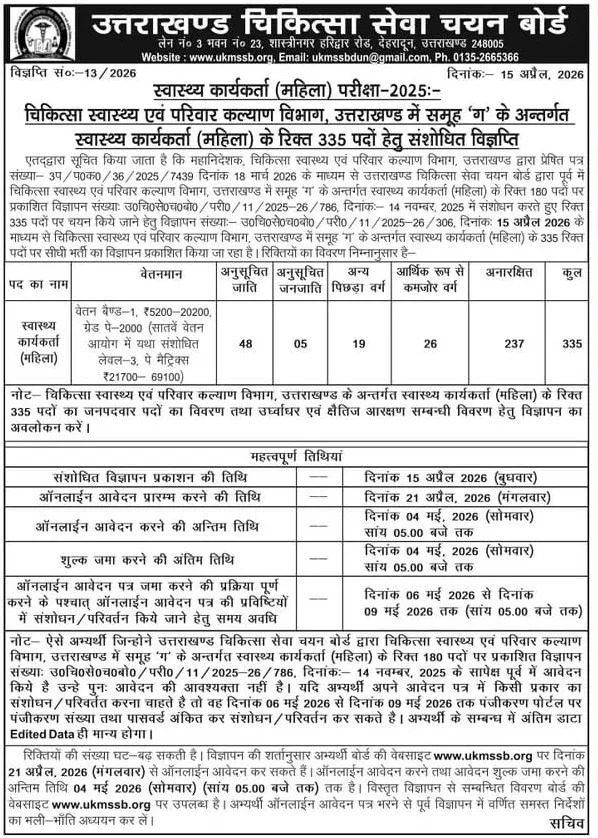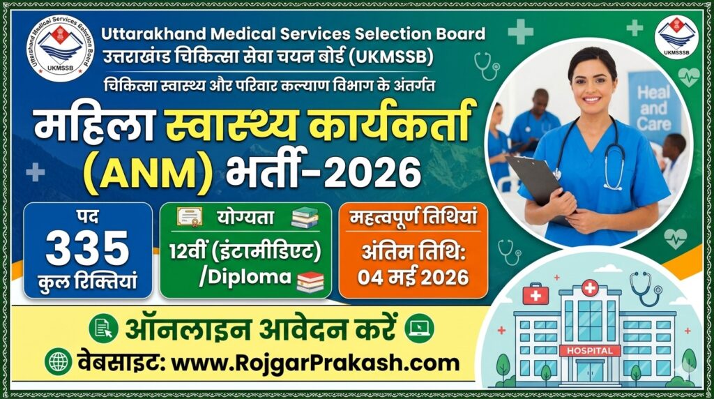 UKMSSB-ANM, Recruitment-2026: The Uttarakhand Medical Service Selection Board (UKMSSB) has released a revised notification for the Recruitment of 335 Female Health Worker/ ANM (Auxiliary Nurse Midwife) posts under the Health Department. This recruitment drive is being conducted for a total of 335 vacancies, and eligible female candidates can apply online within the given dates. The UKMSSB ANM Recruitment 2026 Notification has been released on 15 April 2026, and the online applications are invited from 21 April to 4 May 2026. The eligible candidates can apply online from the website ukmssb.org or ukmssb.in.