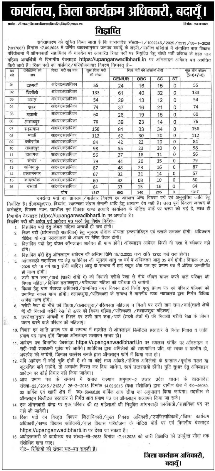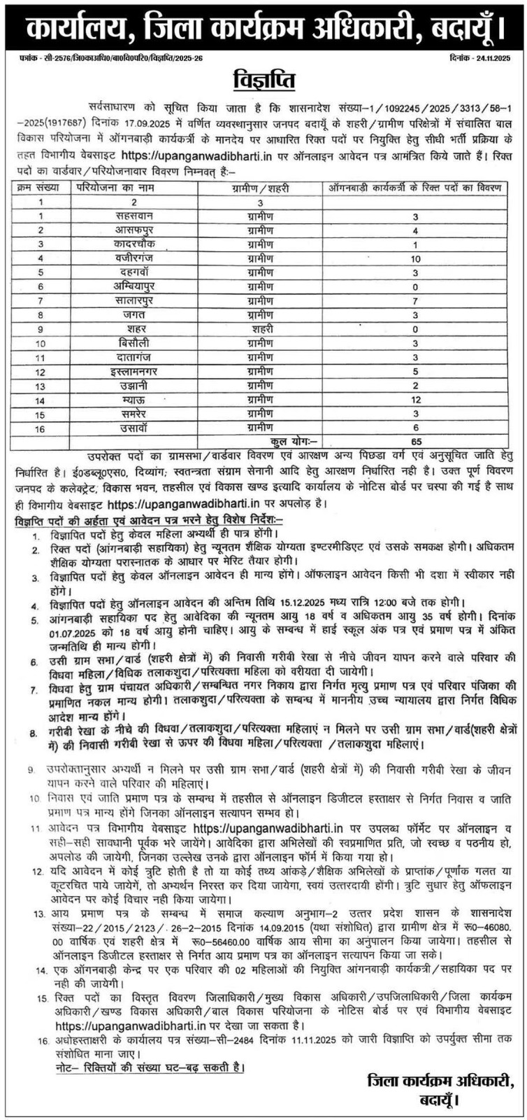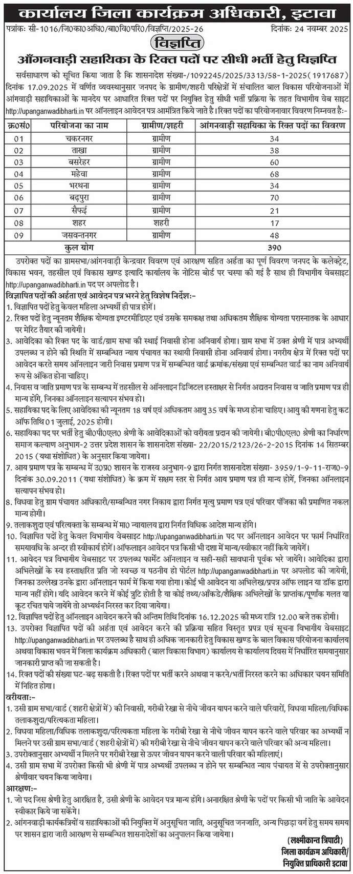 | इटावा –(Worker) इटावा –(Helper) | 22 390 | 19/11/2025 25/11/2025 | 09/12/2025 16/12/2025 | Click Here (Welper) Click Here (Helper) |