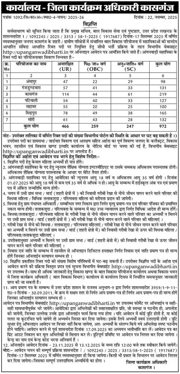 | कासगंज (Helper) | 972 | 23/11/2025 | 13/12/2025 | Click Here (Helper) |